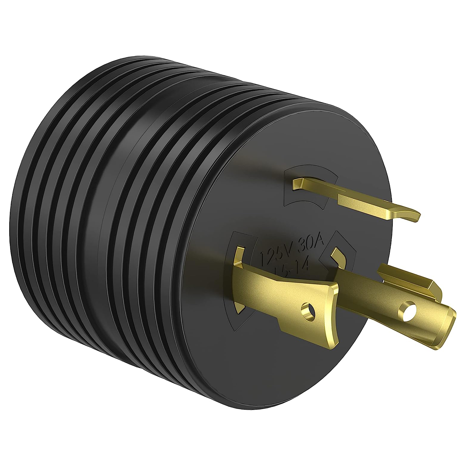 Heavy-duty compact adapter; 30 Amp (L5-30P) male to 30 Amp (TT-30R) female adapter for RVs running 30 amps; perfect for plugging your RV into a generator