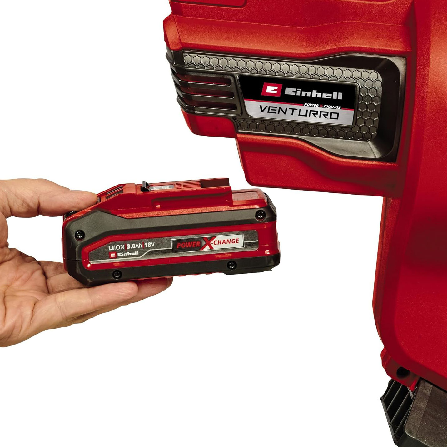 With the Einhell 3-in-1 300 CFM cordless leaf blower/vacuum/mulcher 3433647 (VENTURRO 18/210) tedious leaf collecting is a thing of the past! The powerful 18V cordless tool works completely without power cord. This tool transforms into a leaf blower, a leaf vacuum and has an integrated mulcher. The cordless device is part of the powerful Einhell Power X-Change family, where all batteries and chargers can be combined. With a suction capacity of 300 CFM, the 6.6 lbs lightweight device also removes large amounts of foliage in no time at all, which, thanks to the mulching function, ends up in a 10 Gallon collection bag, reduced to one tenth (10:1) of its original volume. The high quality collection bag is equipped with a viewing window to check the fill level and is quickly and easily clicked into the cordless leaf blower/vacuum/mulcher. A changeover switch can be used to change between suction and blowing functions at any time and without any effort. If the tool is used as a leaf blower, it blows leaves up to 210 km/h. With the electronic speed control, the suction and blowing power can be individually controlled, which also influences the sound level. Thanks to the additional handle, the cordless leaf blower/vacuum/mulcher can be optimally guided with two-hand operation, and a comfortable shoulder strap also ensures optimum weight relief. With two large wheels at the end of the suction pipe, the cordless leaf blower/vacuum/mulcher can also be moved comfortably on uneven terrain, which protects your back. Thanks to an integrated wall bracket, the device can be stowed away in a space-saving way. The tool does not include a battery or a charger. These accessories are available separately.