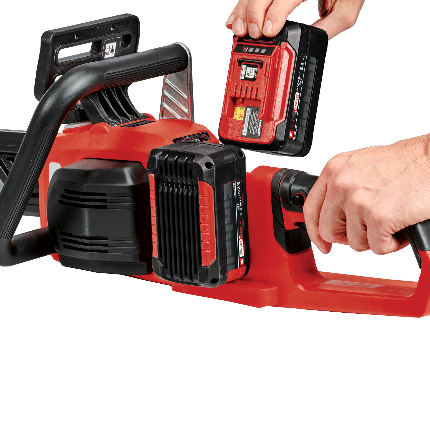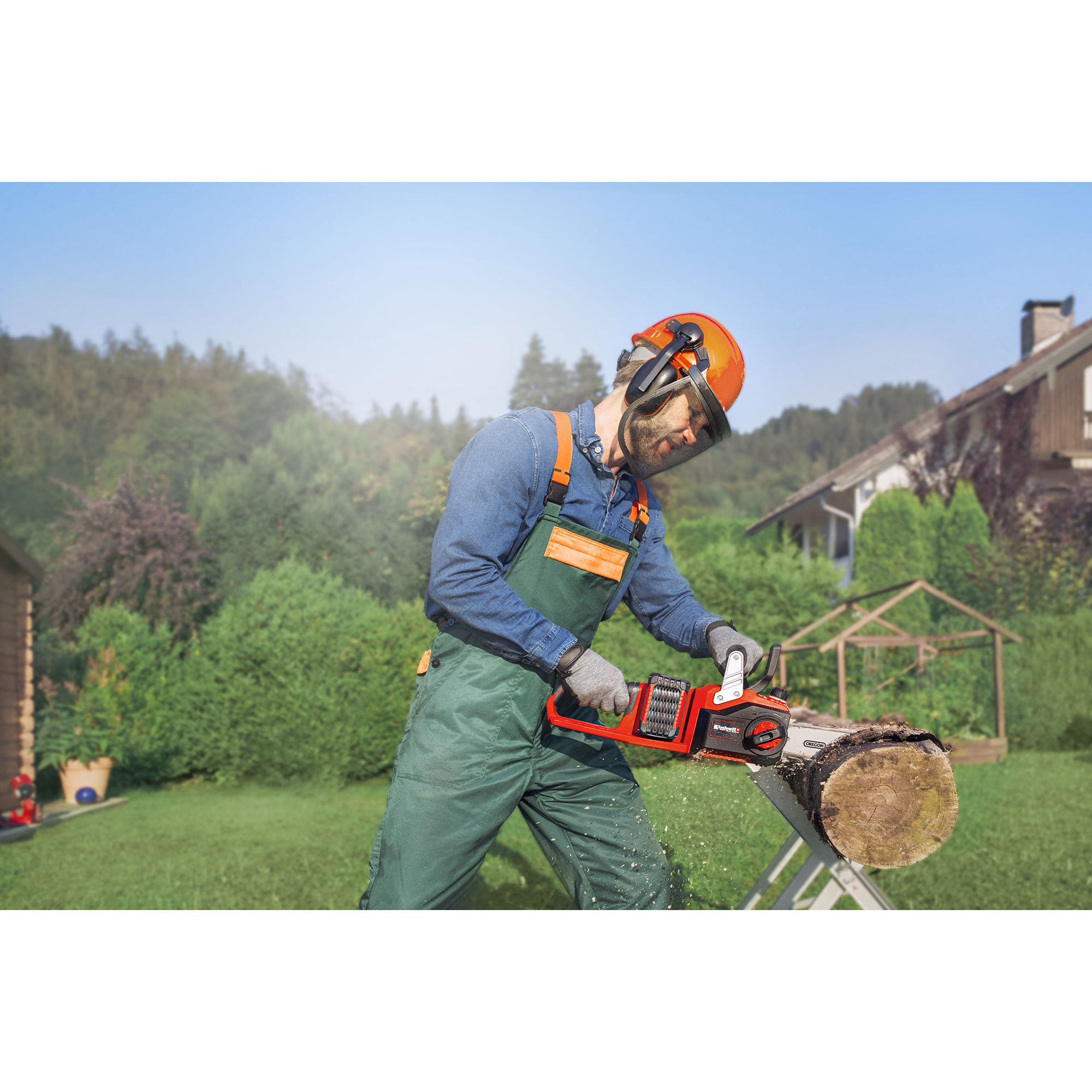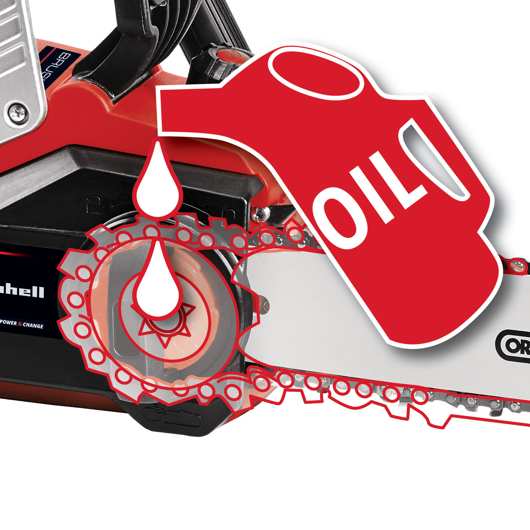 The Einhell GP-LC 36/35 Li-Solo cordless chainsaw features impressive attributes: flexibility, power and user-friendliness. As a member of the Power X-Change family the chainsaw is supplied with power from two high-performance 18 V batteries and is driven by an Einhell brushless motor, the brushless electric motor - far away from the nearest socket outlet. In addition, the cordless chainsaw has a high-quality OREGON guide bar and chain and a cutter rail length of 14 " and a cutting speed of 49 ft/s, so it even cuts through larger trunks. The chain can be changed and its tension adjusted without the need for any other tools. The robust claw stop is made of metal. For extra safety there is kickback protection, the instant-reaction chain brake and the chain catch bolt. The ergonomic handle with softgrip makes it comfortable to work with even on extended work sessions and tough material. Chain lubrication is automatic. A large opening is provided in the oil tank for topping up the oil. The oil tank has a capacity of 0.03 US Gallons. This product comes without a battery or charger. These are available separately, for example as a practical PXC starter set in different performance levels.