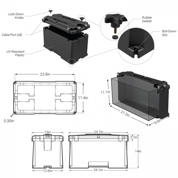 This durable battery box maintains its impact properties at low temperatures and is also UV, oil and gas resistant. This battery box features a large internal reservoir in case of acid overflow. Meets coast guard code of federal regulations.