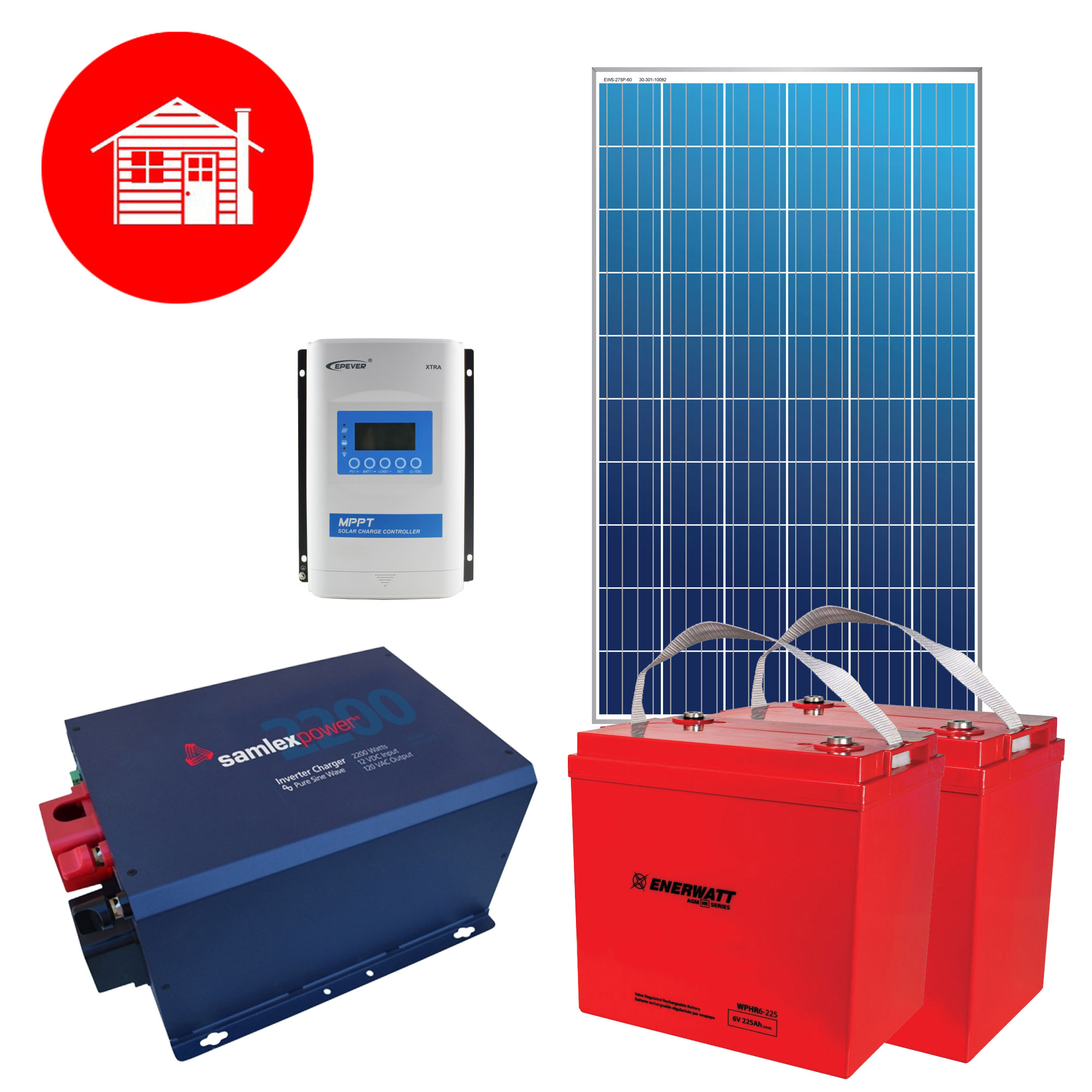 - This 12V kit can supply an average daily consumption of 500Wh, with a reserve of 1300Wh at 50% discharge, 12 months a year. - It can power 12V and 120V appliances up to 2200W. - For 24V appliances, the addition of a DC-DC converter is optional. - The inverter/charger enables the system to serve as an automatic emergency power supply in the event of a power failure. It can also be used to add a generator to recharge the batteries if necessary, all without interruption. - The MPPT controller ensures maximum efficiency in solar energy harvesting. - AGM (sealed) batteries are maintenance-free, requiring only that they be kept as fully charged as possible. They can emit hydrogen during charging and discharging, so external ventilation is recommended.