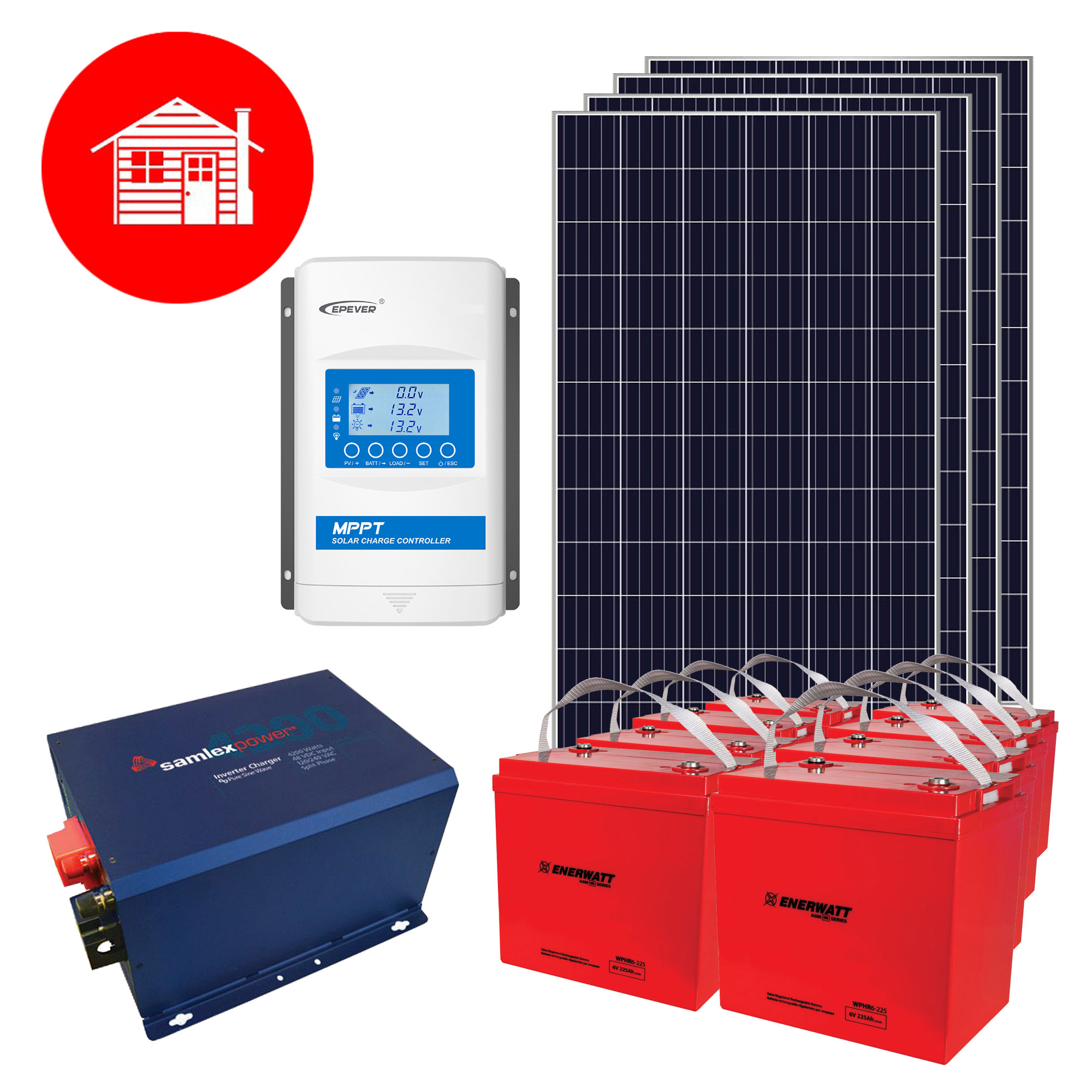 - This 48V kit can supply an average daily consumption of 2000Wh, with a reserve of 5400Wh at 50% discharge, 12 months a year. - It can power 12V, 48V, 120V and 240V appliances up to 4200W. - For 24V appliances, the addition of a DC-DC converter is optional. - The inverter/charger enables the system to serve as an automatic emergency power supply in the event of a power failure. It can also be used to add a generator to recharge the batteries if necessary, all without interruption. - The MPPT controller ensures maximum efficiency in solar energy harvesting. - AGM (sealed) batteries are maintenance-free, requiring only that they be kept as fully charged as possible. They can emit hydrogen during charging and discharging, so external ventilation is recommended.