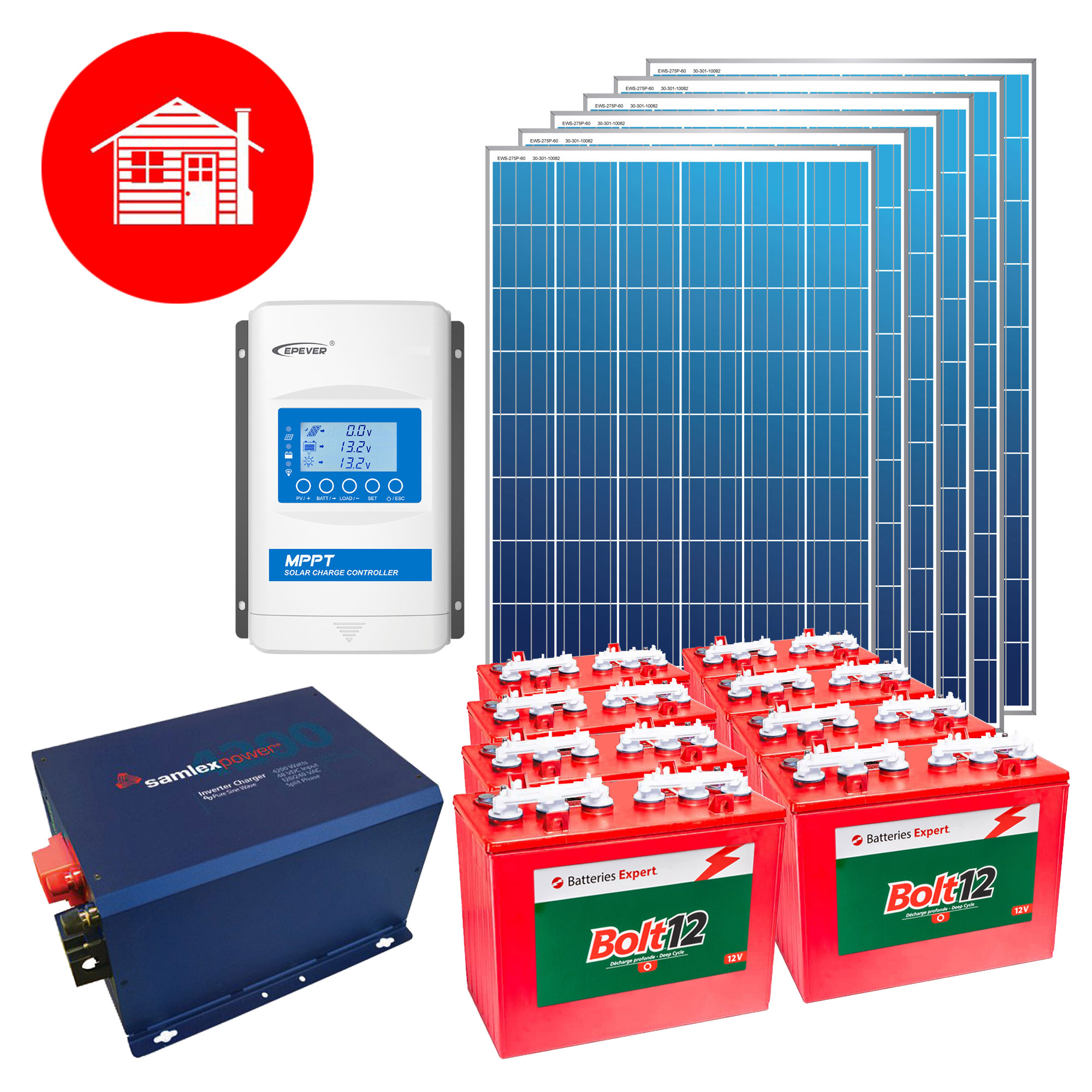- This 48V kit can supply an average daily consumption of 4000Wh, with a reserve of 7400Wh at 50% discharge, 12 months a year. - It can power 12V, 48V, 120V and 240V appliances up to 4200W. - For 24V appliances, the addition of a DC-DC converter is optional. - The inverter/charger enables the system to serve as an automatic emergency power supply in the event of a power failure. It can also be used to add a generator to recharge the batteries if necessary, all without interruption. - The MPPT controller ensures the most efficient harvesting of solar energy. - Flooded batteries require regular maintenance to ensure optimum service life. They also need to be vented to the outside to evacuate the hydrogen emitted during charging and discharging.