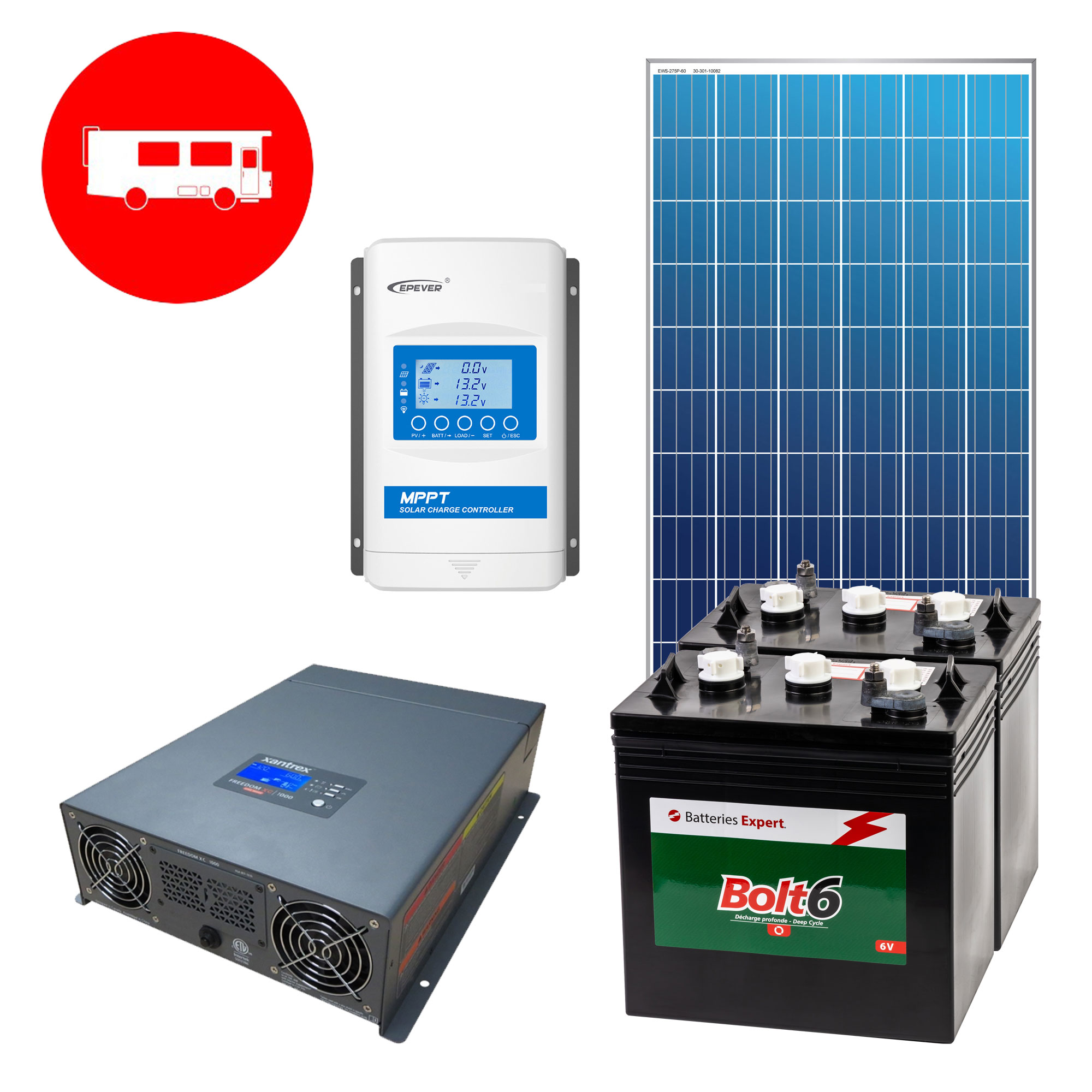 - This 12V kit can supply an average daily consumption of 500Wh, with a reserve of 1200Wh at 50% discharge. - It can power 12V and 120V appliances up to 2000W. - The inverter/charger allows you to add a generator to recharge the batteries when needed, all without interruption. - The MPPT controller ensures the most efficient harvesting of solar energy. - Flooded batteries require regular maintenance to ensure optimum life. They also need to be vented to the outside to evacuate the hydrogen emitted during charging and discharging.