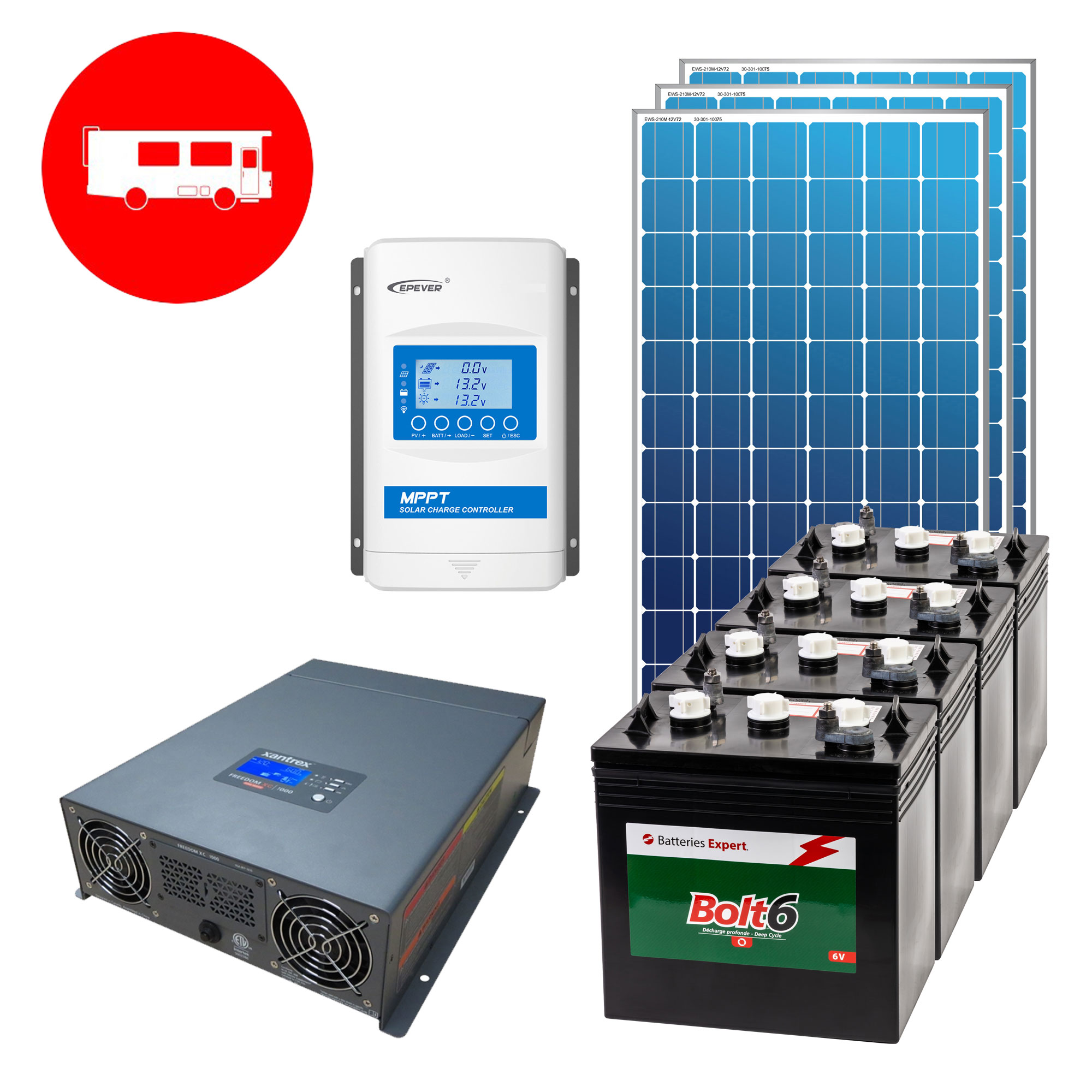 - This 12V kit can supply an average daily consumption of 1000Wh, with a reserve of 2500Wh at 50% discharge. - It can power 12V and 120V appliances up to 2000W. - The inverter/charger allows you to add a generator to recharge the batteries when needed, all without interruption. - The MPPT controller ensures the most efficient harvesting of solar energy. - Flooded batteries require regular maintenance to ensure optimum life. They also need to be vented to the outside to evacuate the hydrogen emitted during charging and discharging.