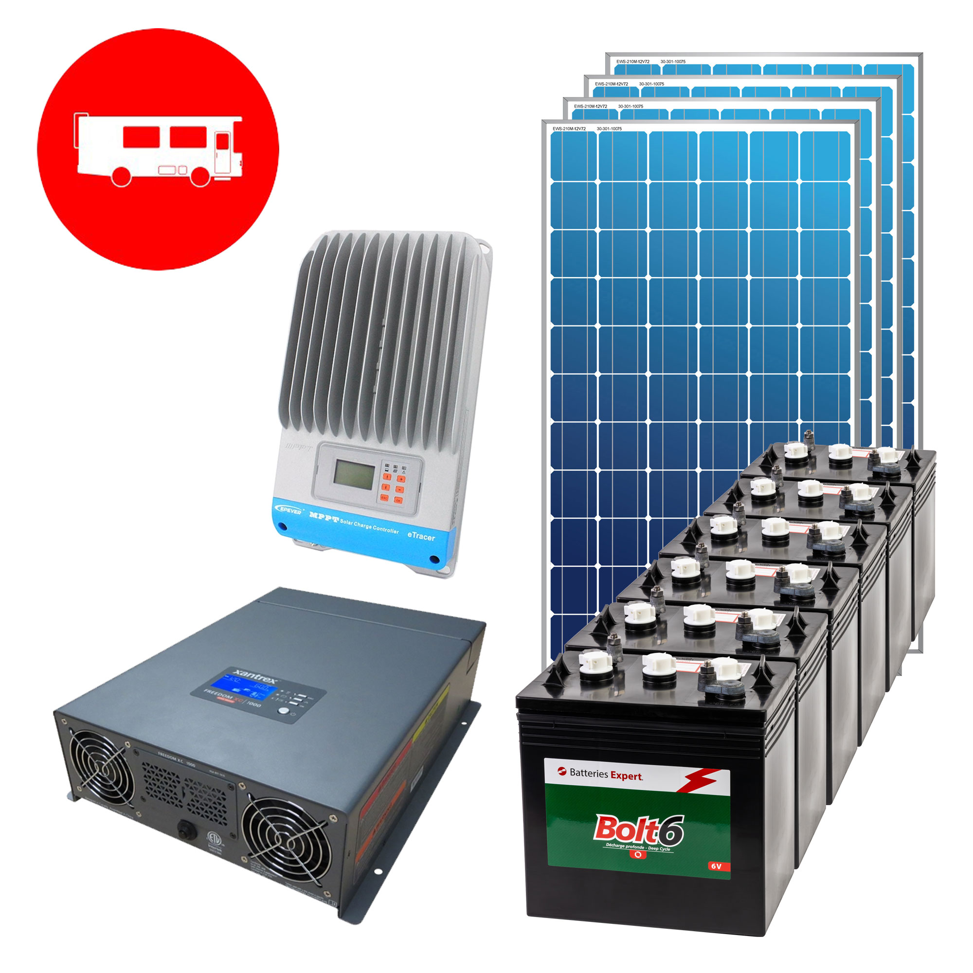 - This 12V kit can supply an average daily consumption of 1500Wh, with a reserve of 3700Wh at 50% discharge. - It can power 12V and 120V appliances up to 2000W. - The inverter/charger allows you to add a generator to recharge the batteries when needed, all without interruption. - The MPPT controller ensures the most efficient harvesting of solar energy. - Flooded batteries require regular maintenance to ensure optimum life. They also need to be vented to the outside to evacuate the hydrogen emitted during charging and discharging.