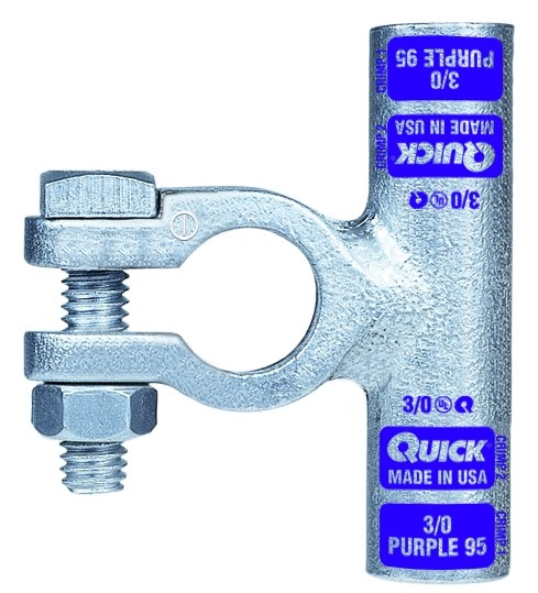 • Made of cast copper alloy, tin plated for added conductivity & corrosion resistance • Quick Connectors are listed by UL® (UL® STD 486A) & CUL , when applied with Quick Cable Quick Crimp tools 4255, 4255M, 4255R & 4255MR (standard and ratchet versions) • 25 times better than SAE conductivity standard, J1811 • Permanent, indelible, readable gauge, and polarity stamped on clamp • Precise dimensions to fit battery posts for maximum contact