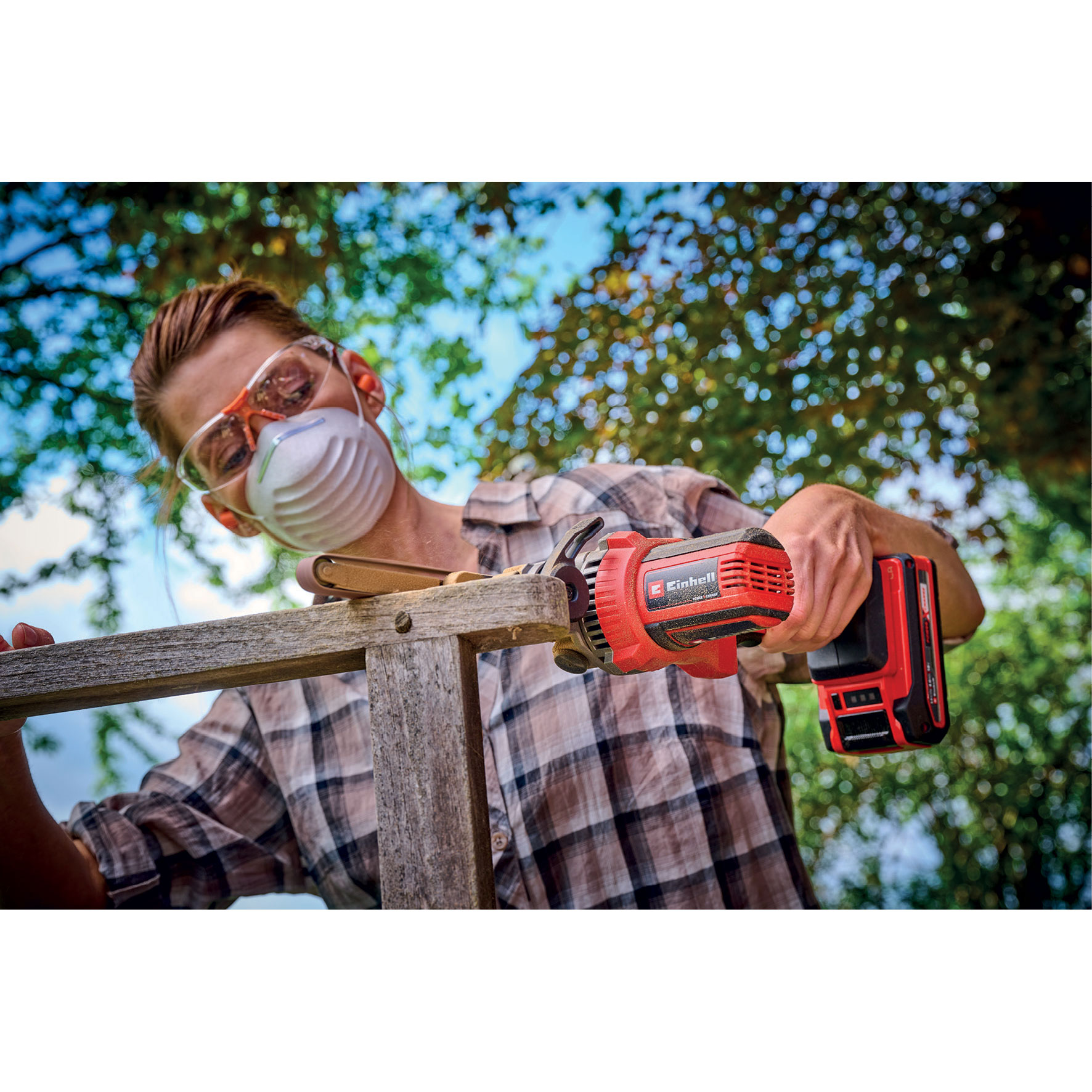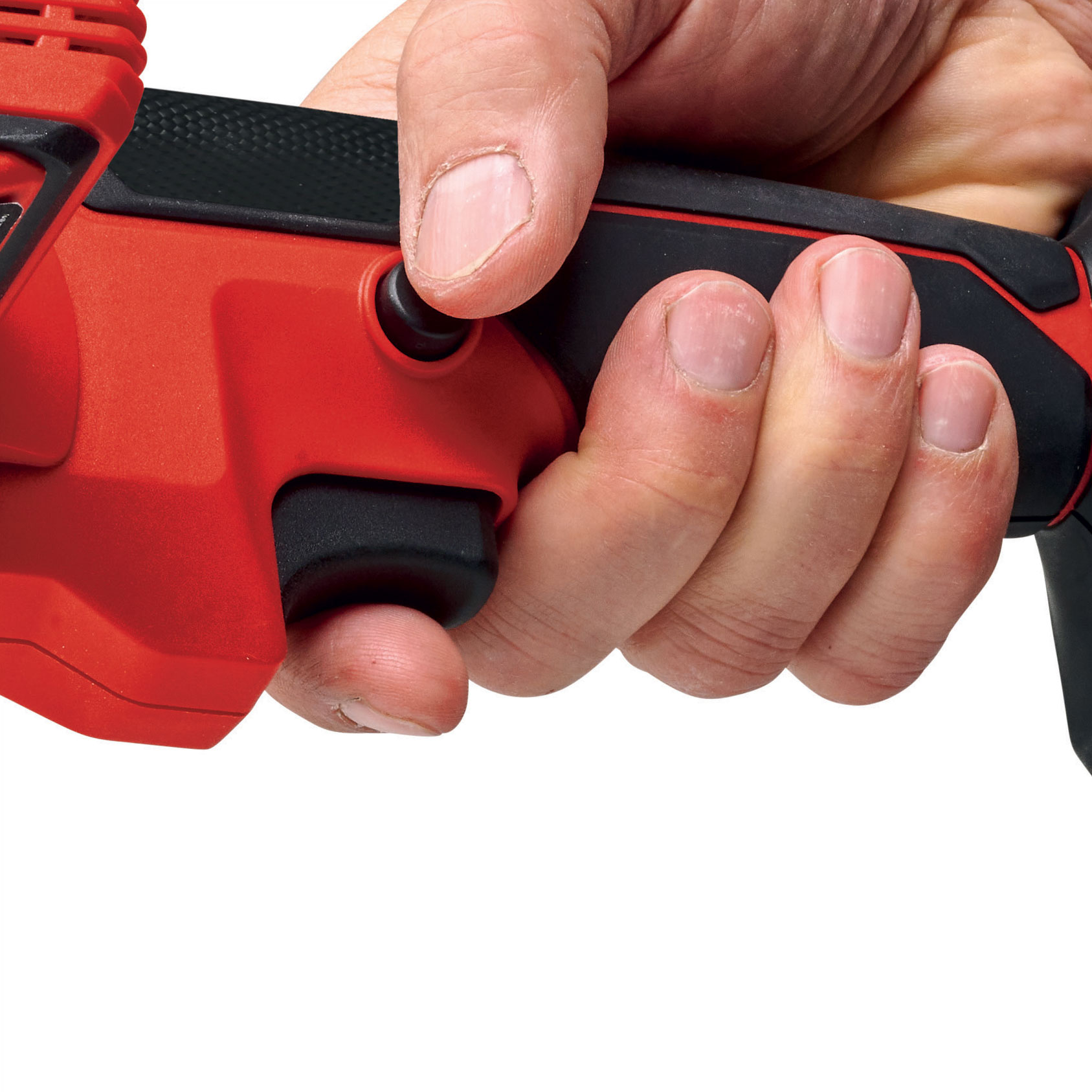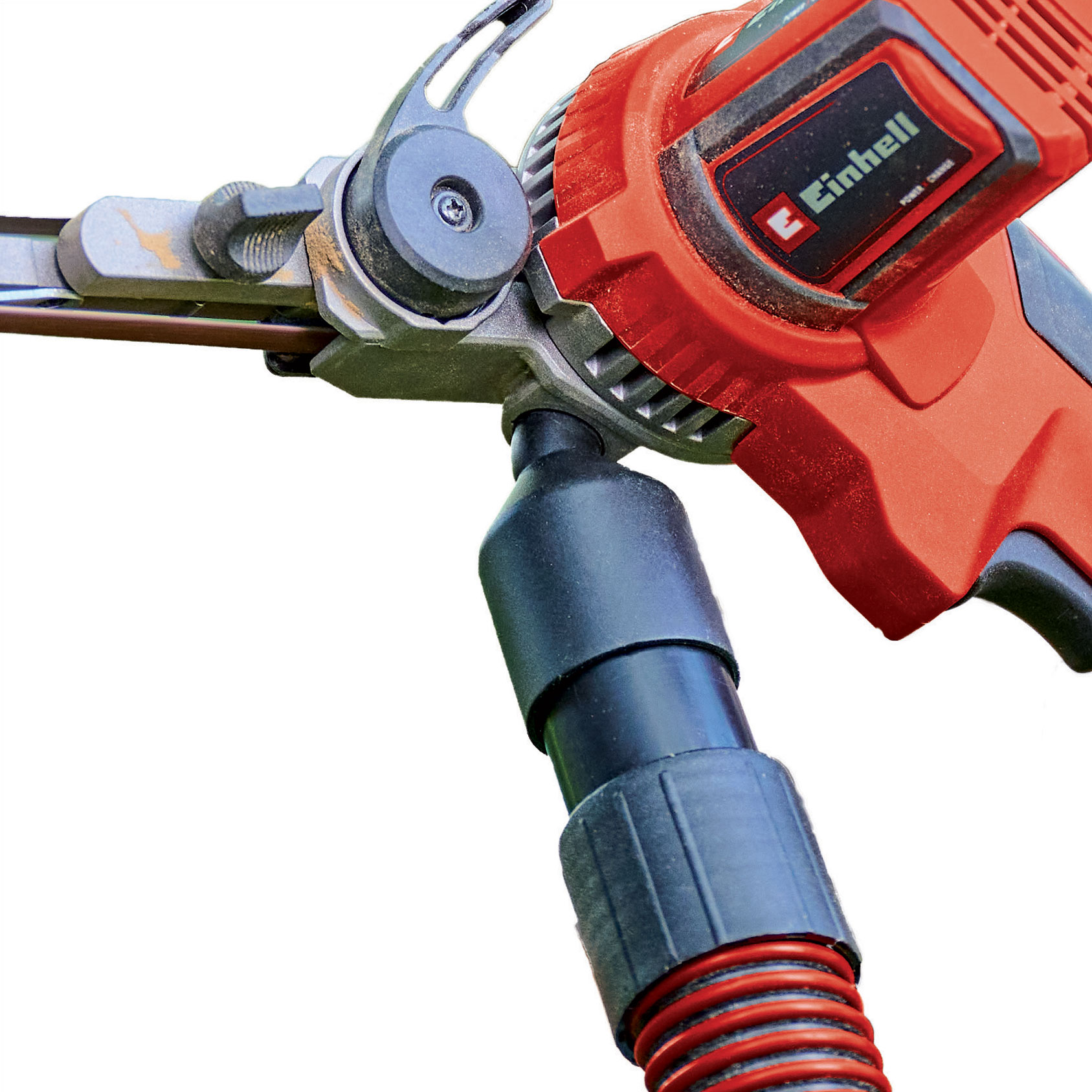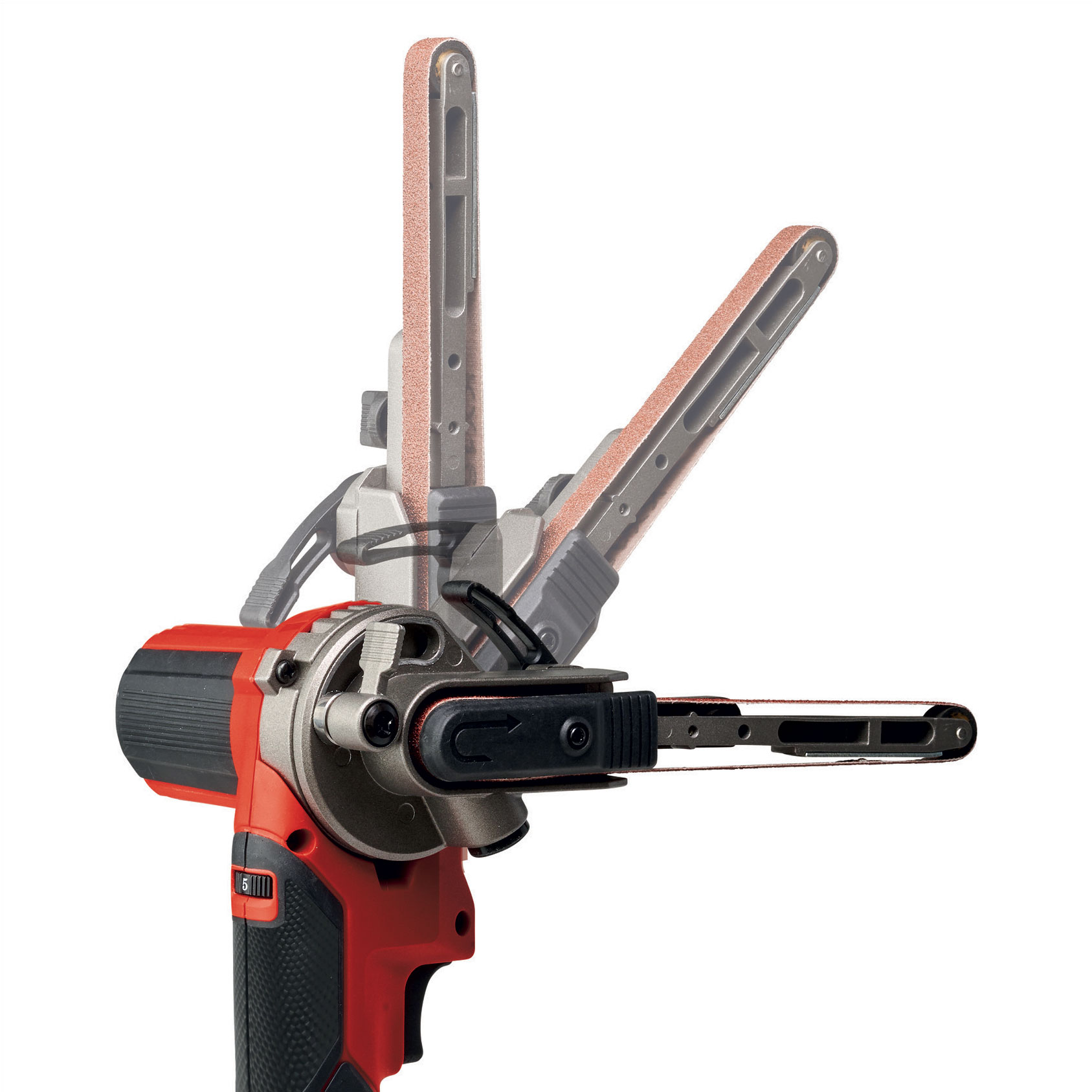 The Einhell cordless file belt sander 4461010 is a practical, handy tool for grinding and deburring hard-to-reach areas. As part of the Power X-Change family, the file belt sander can be used with any battery or charger from the system. It comes with two interchangeable grinding arms with different widths. The narrower 3/8" grinding arm is perfect for tight spaces and for grinding very small, intricate workpieces. With the wider 1/2" grinding arm, even larger, flat surfaces can be tackled. The grinding arm can be pivoted by up to 90°, which gives the flexibility to work from various positions and makes it easier to machine hard-to-reach areas. The speed regulator allows the sanding belt speed to be adjusted between 820-5527 ft./min, so it can be tailored to the workpiece at hand and the desired material removal rate. This means the tool can adapt to wide variety of materials. For more time-consuming work, the handy and lightweight cordless file belt sander has a lock-on button. The sanding belt can be changed via a tool-free, lever-operated mechanism, and the belt tracking is adjusted by a screw on the sanding arm. Thanks to its ergonomic design with Softgrip surfaces, the file belt sander sits comfortably in the hand. The rugged motor housing has a Softgrip cover so it can be used an additional handle for easy handling. The grinding arm casing is made of solid metal. For clean work, a dust chute adapter is included, allowing, for example, Einhell wet-dry vacuums to be connected. The item includes a 12-piece set of sanding belts in two belt widths (two each, 60, 80 and 120 grit), two grinding arms and a practical transport and storage pouch. The tool does not include a battery or charger. These are available separately.