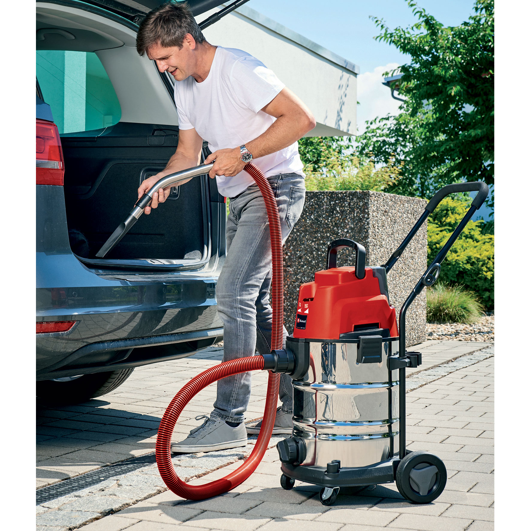 The Einhell 8 Gallon (30L) cordless wet/dry vacuum 2347141 is an indispensable helper for vacuuming, drying and cleaning work in the home, basement, workshop or garage. The cordless wet/dry vacuum is a member of the highly efficient Power X-Change family and can therefore be used with total flexibility far away from the nearest power outlet, and the high-performance and long-lasting rechargeable batteries make it the ideal helper every time even on difficult jobs. As members of the PXC family, all the rechargeable batteries from the complete system series can be used. Two speeds, ECO and BOOST, ensure that the battery is used to optimum effect. The stainless steel tank has a capacity of 8 Gallons (30L) and is rust-resistent and built for sturdiness. The blow connection is for blow-cleaning hard-to-reach areas such as corners, recesses and in-between spaces. Easy transportation is ensured by the large wheels and castors. It is extremely quiet at only 76 dB.