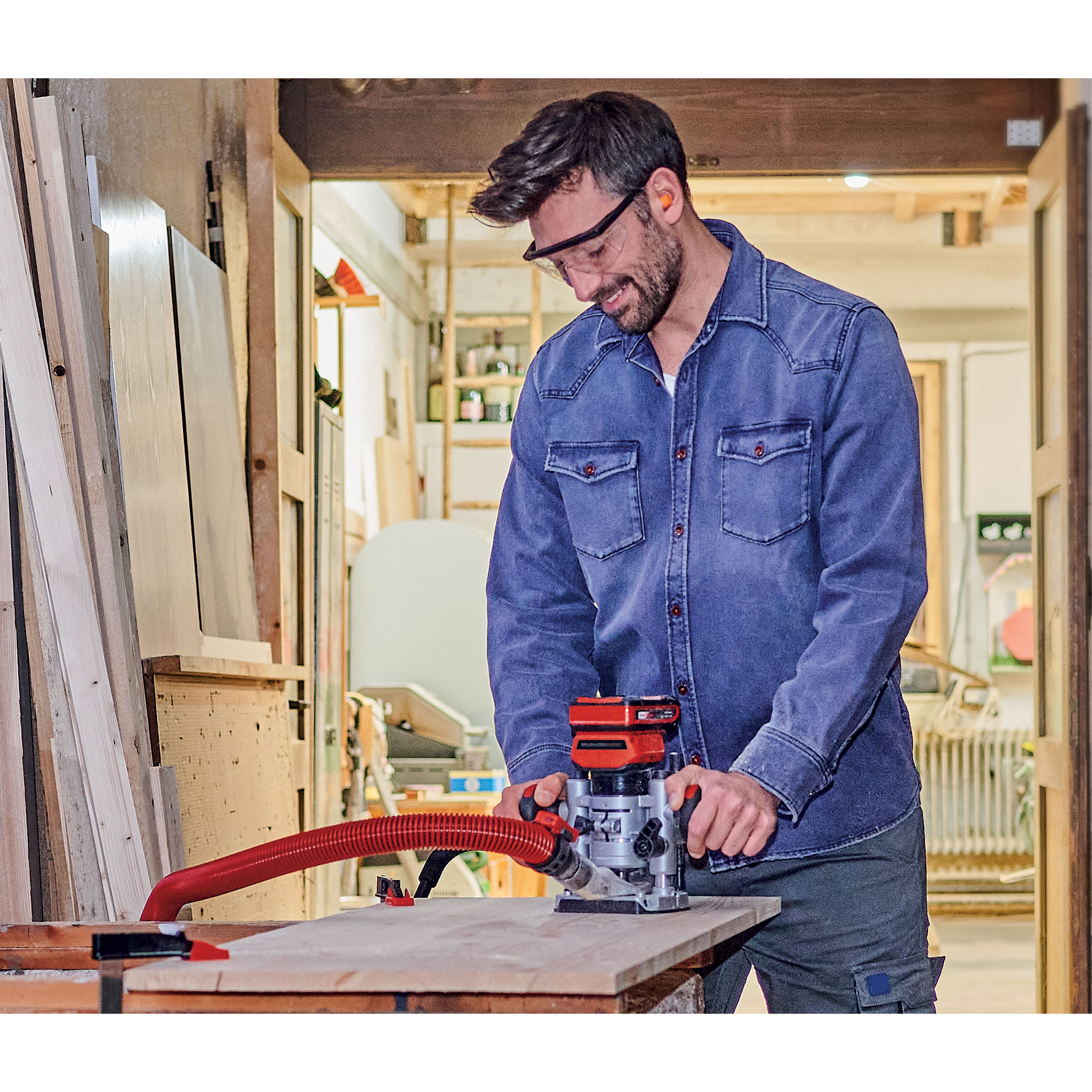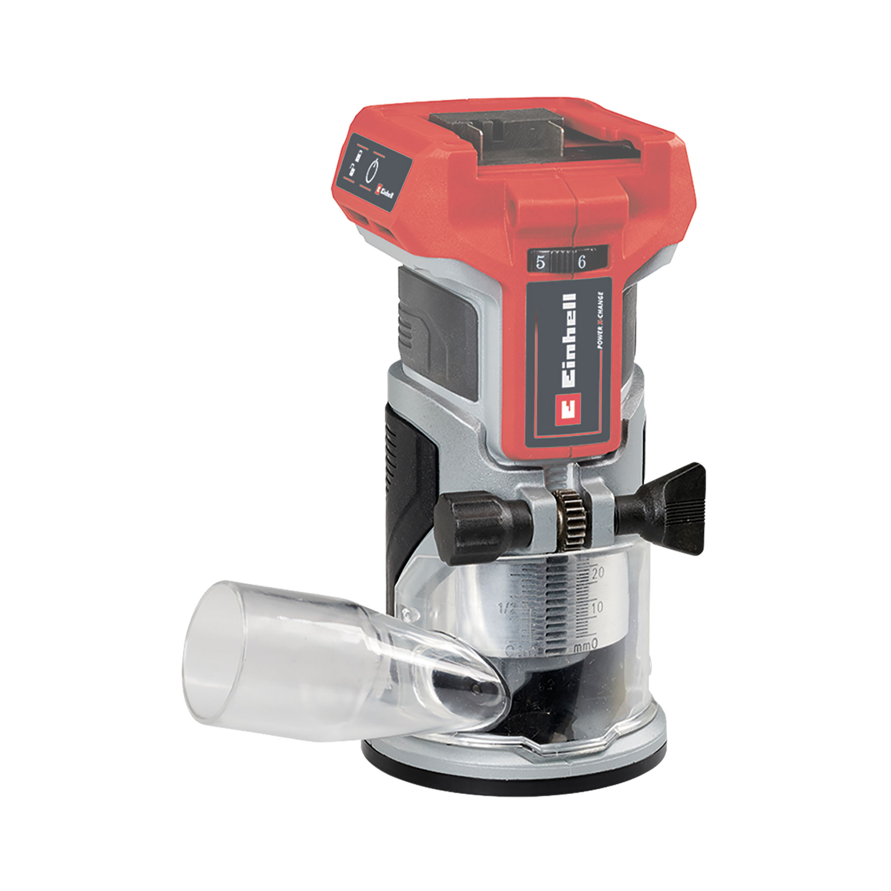 As a member of the Power X-Change family, the Einhell cordless compact router with fixed and plunge base 4350413 offers the freedom of cordless operation. The device is powered by the Einhell PurePOWER brushless motor. This brushless motor offers more power and a longer running time than conventional carbon brush motors. After registering online, the brushless motor comes with a 10-year warranty. Together with a powerful motor, the electronic variable speed control can be perfectly adapted to any task in soft or hard wood. The cutting depth can be infinitely adjusted and features an additional fine adjustment. The depth adjustment is performed with a multi-setting turret stop. The router is equipped with a precise twin-tube guide, a 1/4" collet, and a spindle lock for easy tool changes. The LED light ensures that the working area is perfectly illuminated. A plastic insert protects the surface of the workpiece. The softgrip handle makes for ergonomic and safe working, while the chip shield protects the user against wood chips in the field of vision, and the two-handed plunge base helps to keep the unit under precise control during use. The edge trimmer base also allows edges to be beveled. The unit is supplied with an edge guide, compass point, a template guide and assembly tool, along with a dust extraction adapter for Einhell wet/dry vacuums and a handy storage bag for clean and safe transport. This product comes without a battery or charger. These are available separately.