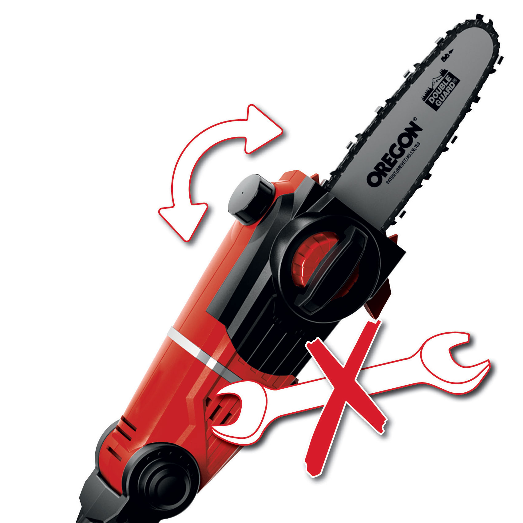 The 2-in-1 Cordless Telescopic Pole Chain Saw / Hedge Trimmer Combo GE-HC 18 Li T is a powerful device to cut branches upside and high hedges easily from the ground. Thereby, the metal gearbox provides a long service life, and the OREGON quality blade and OREGON chain ensure clean cutting results. The top part is rotatable for 90° and allows effortless horizontal cuts. The claw stop prevents slipping during the sawing works. The automatic chain lubrication supplies the OREGON chain with the needed lubrication by means of an oil container. If necessary it can be tightened and changed with its practical chain tension without any tools. A chain catch bolt prevents the unwanted slipping of the chain from the blade reliably. The hedge trimmer knives made of laser-cut and diamond-ground steel ensure clean cutting results. The hedge trimmer can be transported safely and comfortably in the stable bag. The adjustable telescopic handle can be set from 35 to 72" to the required working height. Also, the handgrip can be adapted to any user due to its practical quick lock. To execute even difficult cuts aloft cleanly and precisely, the motor head can be sloped 7-fold and the main grip 4-fold. Therefore, they can be adjusted to every working situation. Battery and charger are not included in delivery.