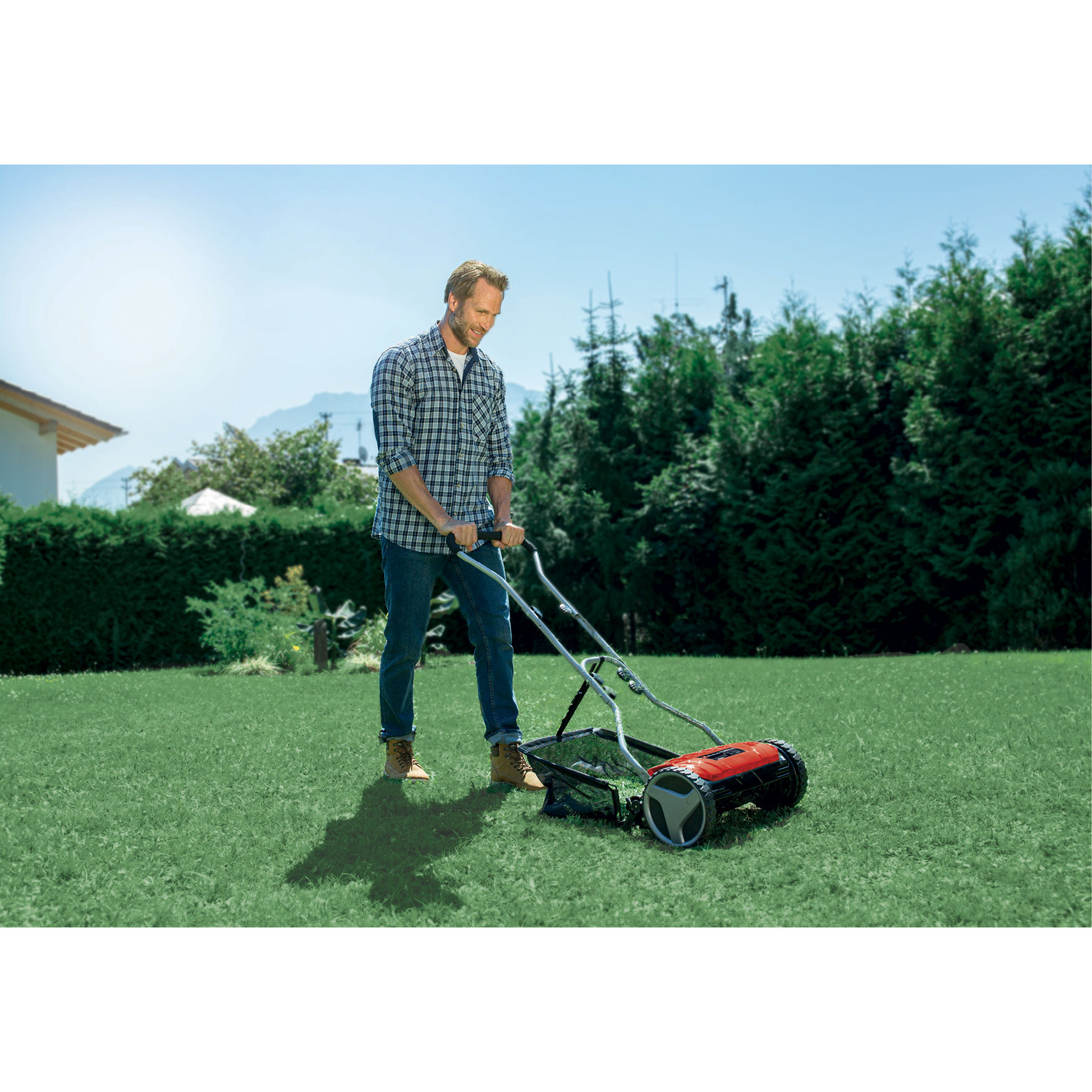 The Manual Push Reel Lawn Mower GE-HM 38 S-F is robust and functional equipment for any hobby gardener, with which smaller lawns can be mowed quietly, with ease, and in an environmentally-friendly manner. The special, contactless cutting technology facilitates the work immensely, as only low friction losses develop between the blade and the counter blade. Thus, not only the necessary energy expenditure reduces, but also the volume. The blades of grass are cut off deeply and cleanly. A fine lawn optics results, nearly as good as cut with shears. This high-quality cylinder mower has a smooth-running mowing spindle mounted in ball bearings with 5 precision-ground cutting knives from high-grade steel and enables an exact adaptation of the cutting height thanks to a four-level cutting height adjustment. The cutting technology of the GE-HM 38 S-F even enables results suitable for golf courses. The lawn mower is additionally equipped with a plastic running roller with a diameter of 2" and large-area, lawn-protecting wheels. Its grass catch box has a capacity of about 6.9 Gallon (26L).