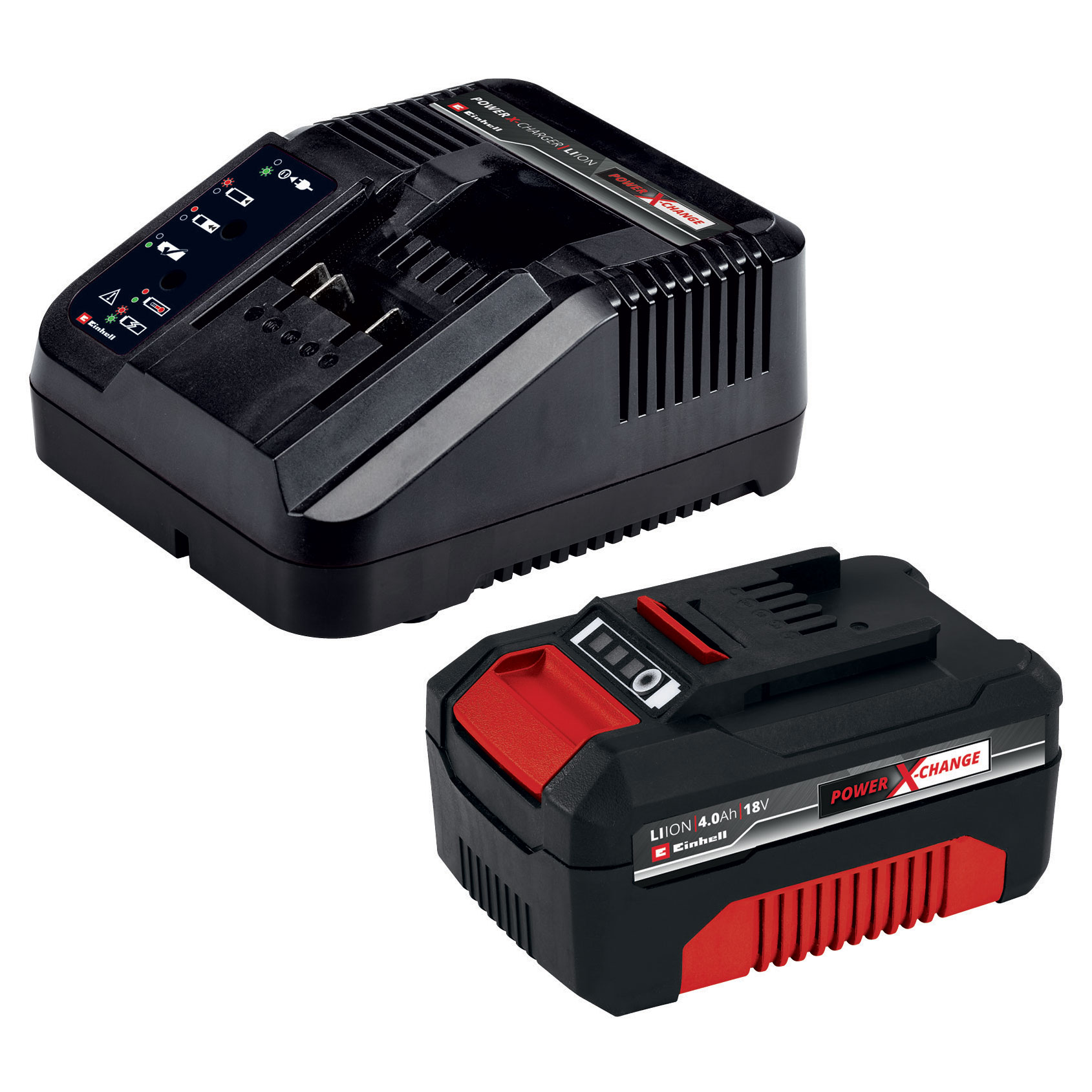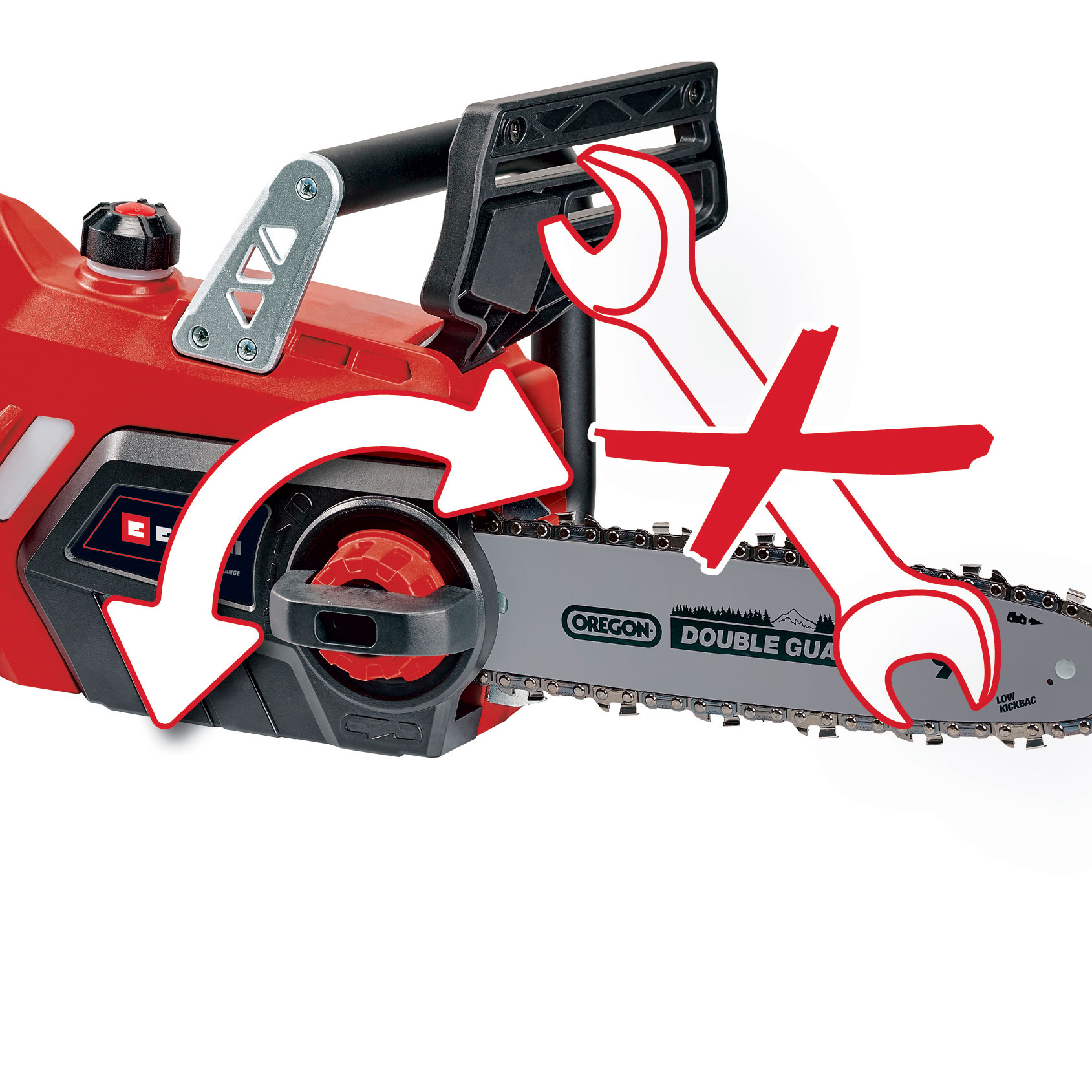 The Einhell Cordless Chain Saw Kit GE-LC 18/25-1 Li includes everything needed by first-time users of Power X-Change or by customers who are buying an additional tool from this product range. You can take Einhell cordless tools anywhere you want without the need for a power source nearby. No risk of tripping over tangled cables, no place you can't reach because the cable is too short, no frustrating search for an extension lead - the Power X-Change family makes all of this a thing of the past. The same battery and charger can be used for all Power X-Change products. The GE-LC 18/25-1 Li cordless chain saw kit combines outstanding Einhell product quality with the cutting performance of an OREGON guide bar and chain. This dependable, handy chain saw is ideal for pruning or felling small to medium-size trees, making firewood and trimming or cutting up construction timber. The Einhell cordless chain saw is safe and easy to use around the garden. Kickback protection and an instant-reaction mechanical chain brake protect you while you are working with the chain saw. The chain stops right away if kickback occurs. A catch bolt holds on to the chain if it jumps off the rail. The rugged metal stop claw keeps the saw stable for your added safety and working comfort. The ergonomic handle gives you a firm grip on the cordless chain saw and it fits easily in your hand. No tools are needed to adjust the chain tension or replace the chain. A big filler opening of the automatic chain lubrication system makes it easy to top it up if necessary. The set includes a fast charger, which can be used for all Power X-Change batteries, together with a rechargeable Power X-Change battery. The high-performance battery has a charge level indicator. Three LED show you at a glance how much charge is left in the battery. The same rechargeable battery can be used for all members of the Power X-Change family. The fast charger is suitable for all Power X-Change batteries.