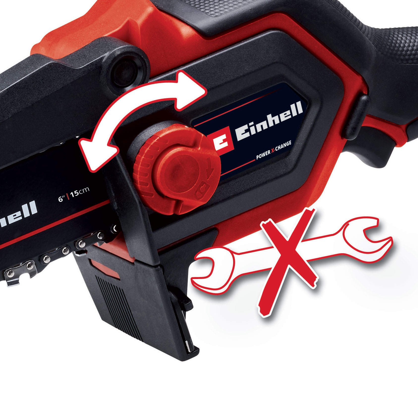 The Einhell 6" cordless pruning chain saw 4600035 (GE-PS 18/15 Li BL-Solo) is a handy tool for trimming trees and shrubs as well as for shredding green cuttings and for smaller pruning work. The compact chain saw is a member of the Einhell Power X-Change family and can be combined with all batteries and chargers of the system family. The device is powered by the Einhell PurePOWER brushless motor. This brushless motor offers more power and longer running time than conventional carbon brush motors. After online registration, there is a 10-year warranty on the brushless motor. With a bar length of 6", the small and lightweight cordless pruning chain saw is ideal for use in the garden. The highly efficient motor ensures very low vibrations and a chain speed of up to 189 IPS. The chain saw is supplied with a high-quality bar and chain set for high cutting performance and best work results. The bar and chain can be changed easily and without tools for easy maintenance. For safe use, the chain saw has a hand guard and a folding chain cover. This practical garden tool is comfortable to hold thanks to the slim handle, special softgrip surfaces and the integrated hand rest for two-handed use. A bar protective cover is included for safe storage of the chain saw. Also included are a empty oil bottle for manual oiling of the chain and a hex. key for tensioning the chain. The hex. key is stored directly on the device and is therefore always at hand. The tool does not include a battery or a charger. These accessories are available separately.