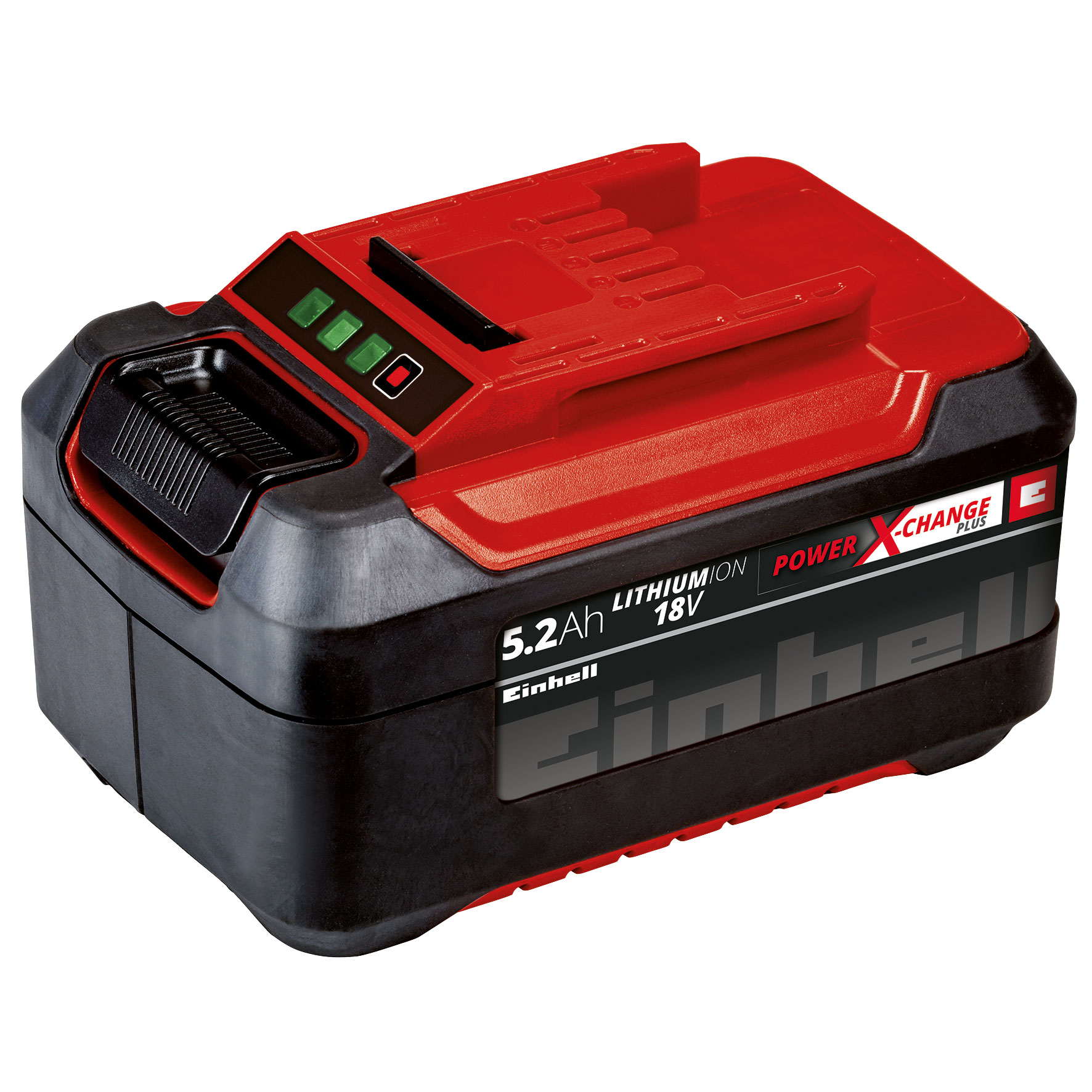 The Einhell 18 V 5.2 Ah Power X-Change Plus rechargeable battery is a powerful rechargeable battery for helping DIY enthusiasts and gardeners perform jobs with intensive work requirements and carry out their projects with real confidence. The powerful 5.2 Ah rechargeable battery is a member of the multifunctional and interchangeable Power X-Change system series from Einhell. The Power X-Change Plus rechargeable battery has high-quality lithium-ion cells and delivers enhanced performance thanks to advanced technology. The battery can be used universally in all the devices from the Power X-Change system series from the garden and workshop range. This means that the battery can be used with every charger from the system series. The maximum safety provided by the 18 V 5.2 Ah Power X-Change Plus rechargeable battery is ensured by the proactive battery management system from Einhell. The batteries have a much longer service life, because the charging cycles are adjusted to the specific situation. The high-quality lithium-ion cells are resistant to the self-discharging normally associated with batteries. At the same time the batteries can be recharged at any time without incurring any damage. A three-step LED battery charge status indicator shows the actual charge status at a glance. State-of-the-art components provide permanent monitoring of the parameters during charging. A rubber-coated housing provides excellent impact protection and a firm hold as well. Integrated recessed handles enable the battery to be taken out effortlessly and ergonomically.