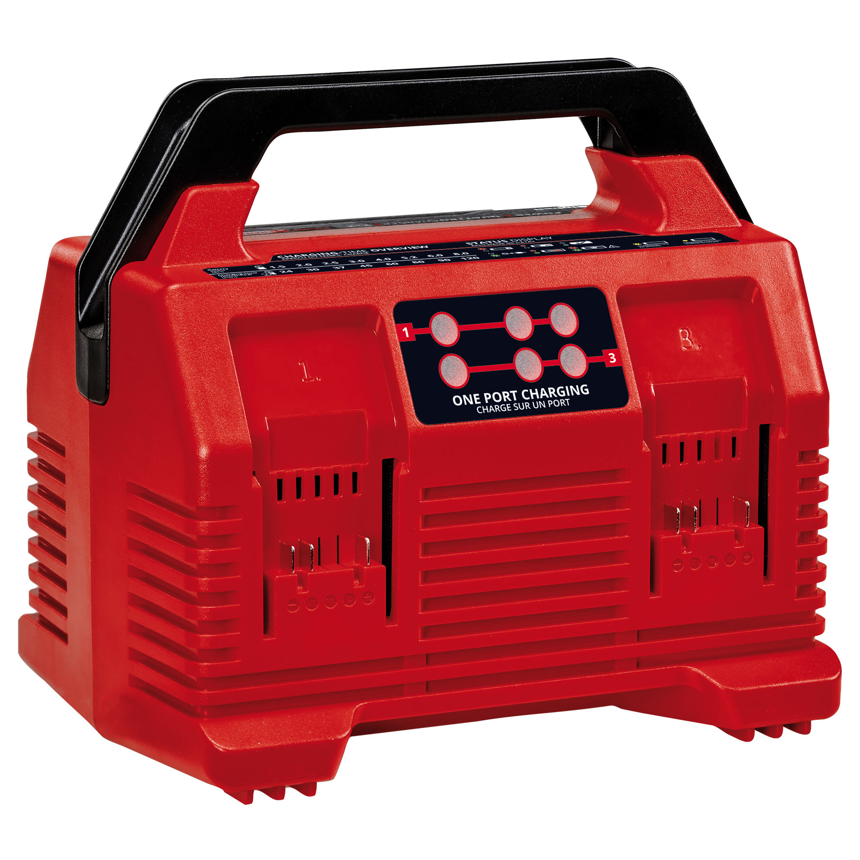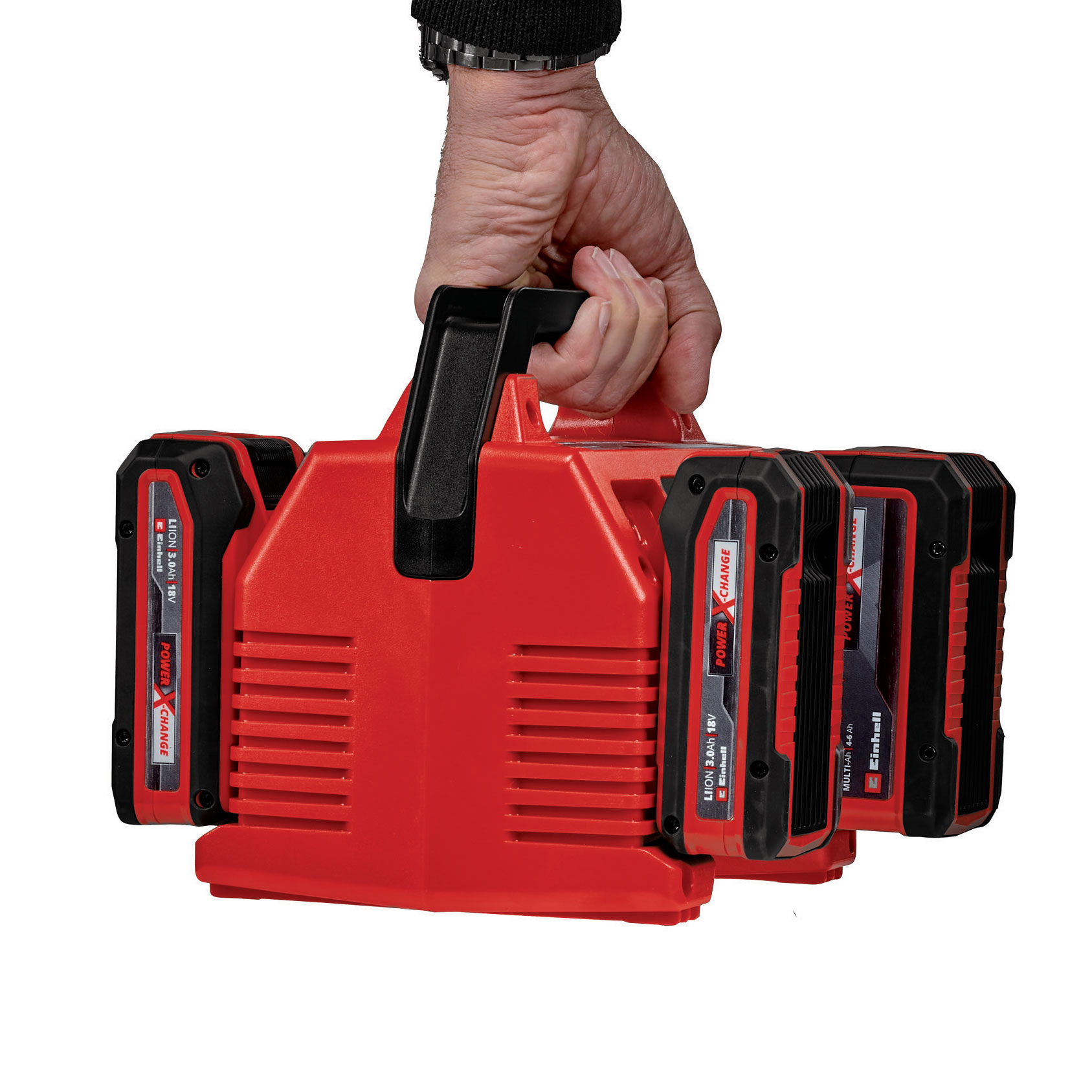 With the Einhell 18V 2 x 2 PXC 4 port fast charger 4512122, two Power X-Change system series batteries can be charged at the same time. One battery for all devices: Power X-Change batteries can be used in all craft and garden tools of the powerful Einhell system series. The charger can be used universally for all PXC batteries. The advantages for customers are clear: with one battery and one charger for all devices, customers not only save considerable costs on the purchase, its universal use protects the environment and also offers flexibility in the home and garden. Continuous, simultaneous charging of two batteries – one battery per side – saves space and ensures not only fast and high availability but also uninterrupted work. Once two batteries are fully charged on each side, the next two are automatically charged. Charger comes with a carrying handle, which allows easy and effortless transport of 4 batteries. Thanks to its low weight, the 2 x 2 PXC 4 port fast charger is ideally suited for mobile use. Four battery slots can be used with one plug, saving space on work tables & construction sites. Thanks to the 4A fast charging technology, charging times are even shorter, and the battery is constantly monitored by the smart charging management system for optimal charging and top safety. Thanks to the refresh mode, it is possible to reactivate deeply discharged batteries. All current information is provided via a 6-stage LED status indicator for each battery.