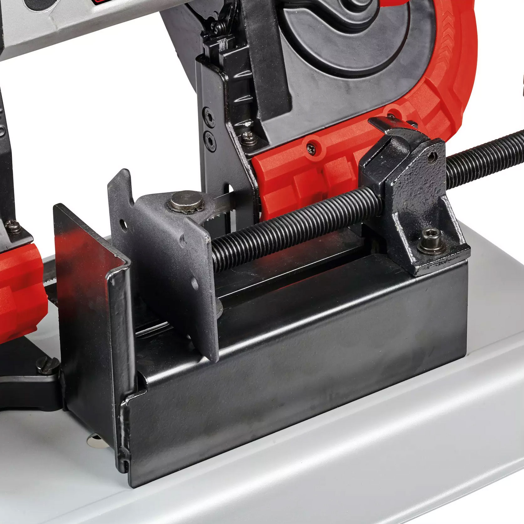 The Cordless Metal Bandsaw Mitre Stand is a perfect fit for the 5" Compact Cordless Metal Bandsaw TE-MB 18/127 Li (Einhell 4504220), providing greater stability and making it easier to cut long pieces of material with greater precision. The stand is also suitable for other bandsaw models. Easy installation thanks to comprehensive accessories and tools. Screws, nuts, a hex key and a wrench are supplied with our portable mitre support for cordless metal band saws. As a result, installation of the mitre support can be completed in around fifteen minutes using the manual. The portable mitre support makes your bandsaw even more efficient. This portable bandsaw table is small enough to fit on a workbench with 4 holes in the legs. The vice, with its quick-release locking handle, makes it easy to clamp and position material quickly. You'll notice the good weight capacity and excellent build quality. According to tests, the durable mitre support can withstand a load of 220 pounds. Best of all, thanks to the fine polish and silver-grey powder coating, the edges and corners are rounded and not sharp.
