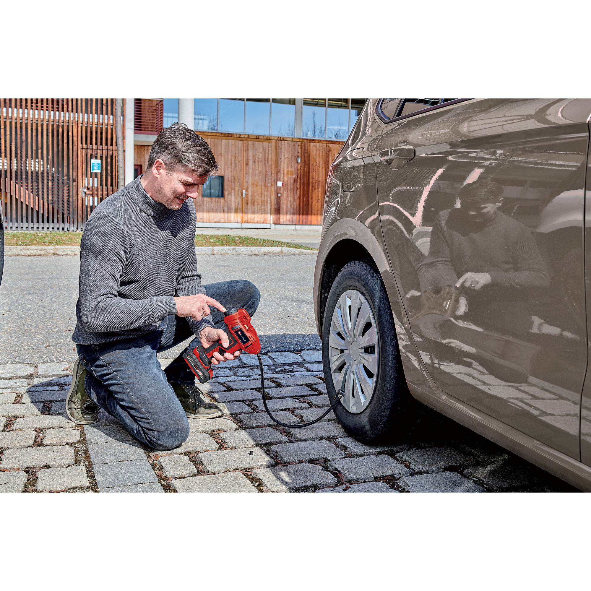 The Einhell cordless high pressure inflator with digital gauge 2071020 is a particularly lightweight and handy compressor that is ideal for smaller jobs such as inflating car tires, wheels or balls. As a member of the high-quality Power X-Change family, each battery in the high-performance product series can be combined with the cordless high pressure inflator. The battery-powered cordless high pressure inflator has a digital gauge for quick and easy reading of the current settings. The desired pressure can be effortlessly set, up to a maximum of 160 PSI. When the set pressure is reached, the cordless high pressure inflator switches off automatically. You can select between bar, PSI and kPa via a push button. Manual inflation is possible at any time without presetting. The 3-piece inflation adapter kit can be stored directly on the inflator. The ergonomic handle makes it easier to use. Comes with a 23" an air hose with a tire valve for flexible reach. Delivery does not include a battery or charger, but these are available separately.