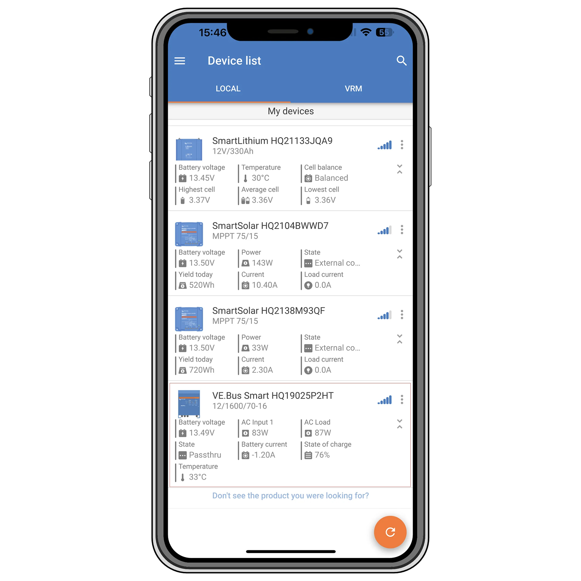 It also adds Instant Readout to the VE.Bus product and displays the inverter/charger's key data on the VictronConnect device list page without requiring a connection to the product. This includes visual notifications of warnings, alarms, and errors, allowing for at-a-glance diagnostics.