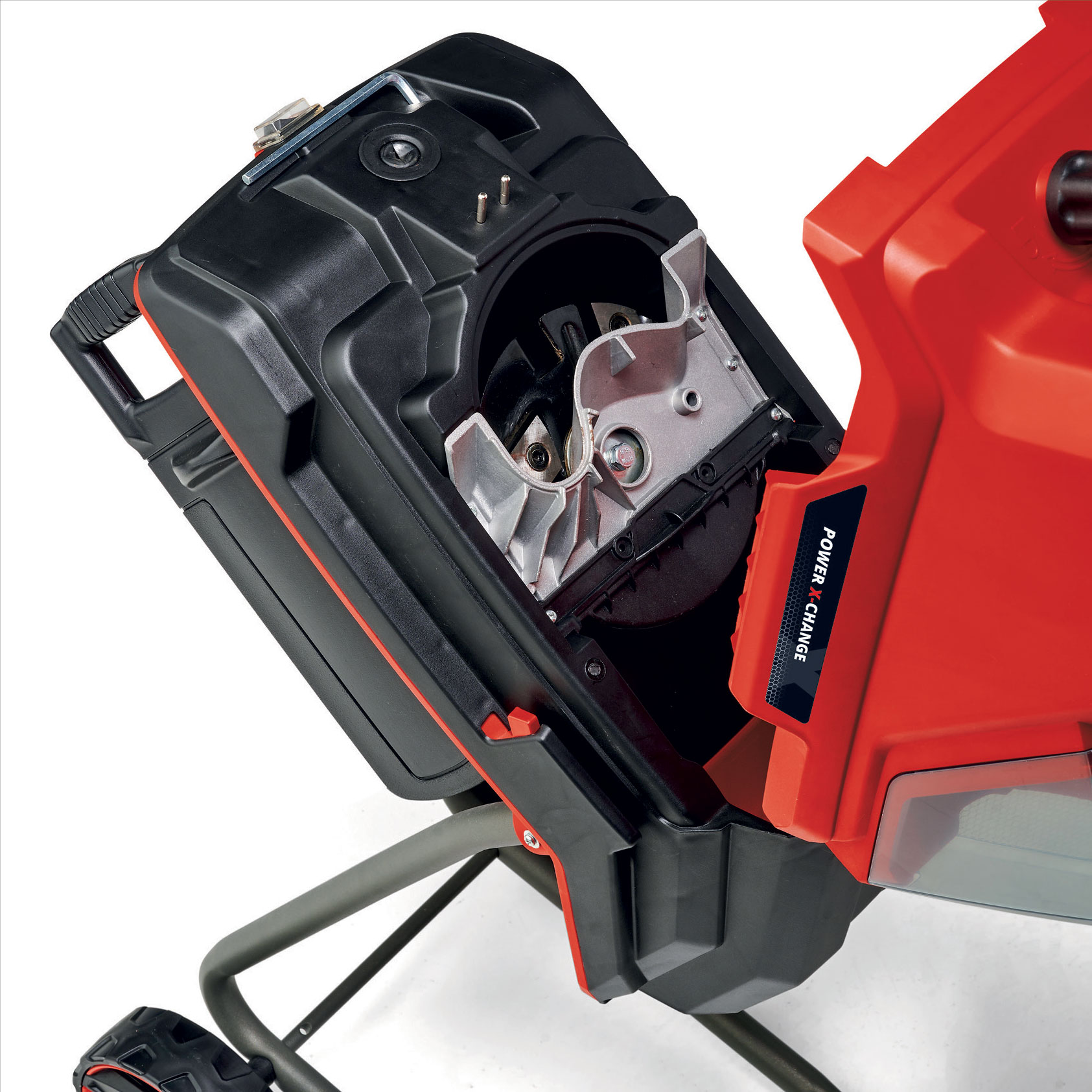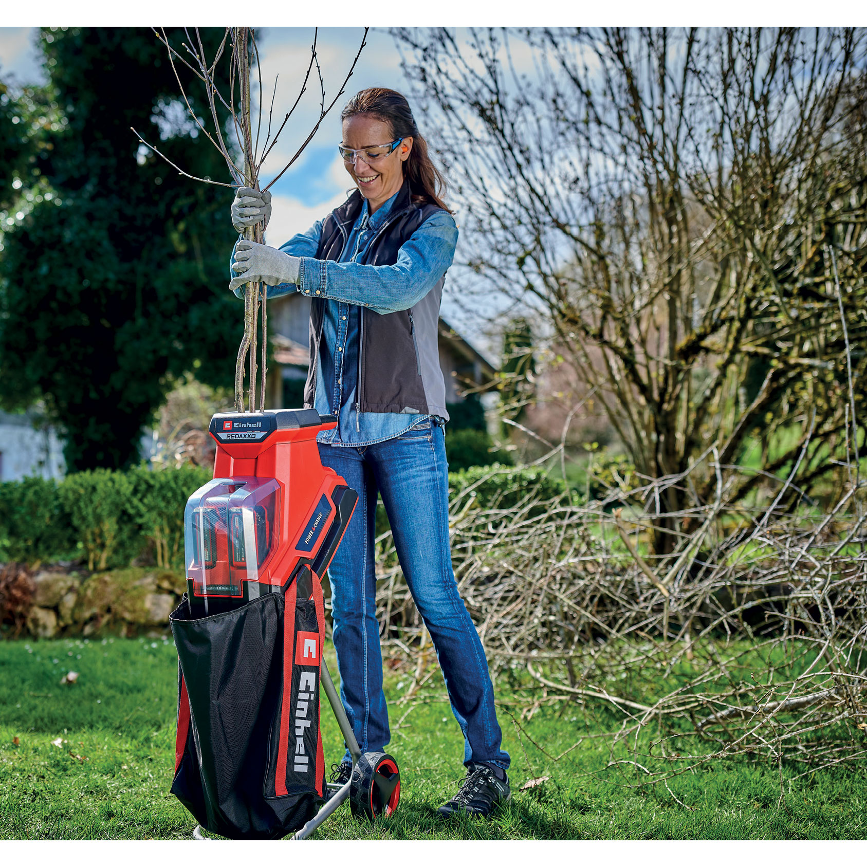 La déchiqueteuse/broyeuse à bois sans fil 3430730 (REDAXXO 36/25) d'Einhell offre la liberté du sans fil dans le jardin ! Peu importe l’endroit où se trouvent les déchets végétaux comme les tiges d’arbustes ou de haies taillées, feuilles ou branches : la déchiqueteuse/broyeuse à bois sans fil se déplace pour les broyer directement sur place, sans aucune alimentation électrique. La déchiqueteuse/broyeuse à bois sans fil fait partie de la gamme Power X-Change d'Einhell et peut être combiné avec tous les batteries et chargeurs de cette même gamme. La technologie Twin-Pack 36V combine la puissance de deux batteries 18V pour une puissance maximale. Pour une performance optimale, il est recommandé d’utiliser des batteries 4,0 Ah ou supérieures. Pendant l’utilisation de l’appareil, les batteries sont protégées des salissures, de la pluie et des chocs par le couvercle de batterie pliable. Qu’il s’agisse de branches sèches et dures ou de feuilles, tiges d’arbustes ou de haies taillées, l’entonnoir à large ouverture et le bâton poussoir permettent d’introduire facilement et en toute sécurité tous les déchets végétaux d’un diamètre maximal de 25 mm (1") dans la déchiqueteuse/broyeuse à bois. Selon le matériel, les déchets broyés peuvent ensuite être éliminés sans encombrement, compostés ou utilisés comme paillis. Grâce au support intégré, le bâton poussoir fourni est toujours accessible. Un sac de collection de déchets haute qualité d’une capacité de 55 L (14,5 gallons) est également inclus qui s’accroche simplement aux crochets prévus sur le carter de l’appareil. Grâce à son châssis robuste sur roues et à sa poignée intégrée, la déchiqueteuse/broyeuse à bois sans fil est particulièrement mobile. Pour faciliter son nettoyage et sa maintenance, la déchiqueteuse/broyeuse à bois est équipée d’un entonnoir rabattable doté d’un loquet de verrouillage de sécurité. Il est ainsi possible d’éliminer facilement les bourrages pour que les trois lames réversibles en acier spécial puissent à nouveau broyer efficacement. Le disjoncteur protège le moteur contre les surcharges et garantit la sécurité pendant le fonctionnement de l’appareil. L'outil est fourni sans batteries ni chargeur. Ces accessoires sont disponibles séparément.