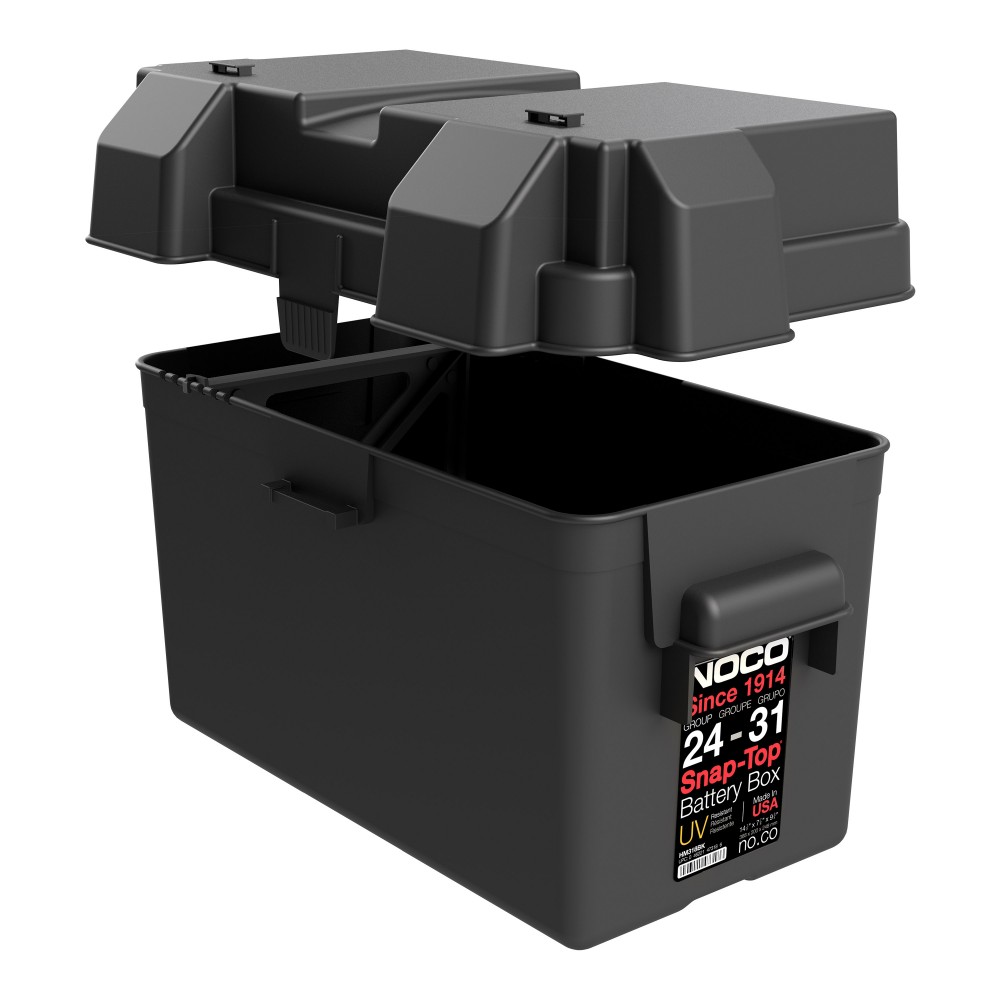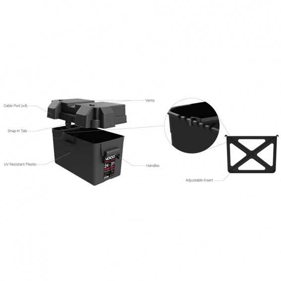 La boîte de batterie M318 est un excellent boîtier pour stocker ou déplacer les batteries de groupe 24 au groupe31 Automobile, marine et VR. Ses poignées en plastique renforcé prévenienent fissure. Ses fonctionnalités de ventilation empêchent les vapeurs d’acides émanant de la batterie de s'accumulent à l'intérieur de la boîte.