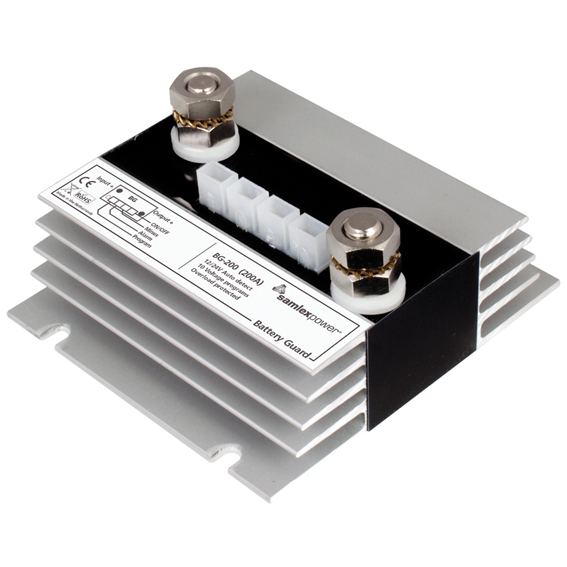 Le relais de sécurité BG-200 peut transporter 200 A en charge continue et 210 A en charge transitoire. On peut choisir parmi 10 seuils de tension pour la mise sous et hors tension des systèmes de 12 et de 24 V. Ces seuils sont faciles à programmer.